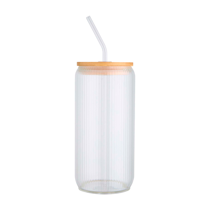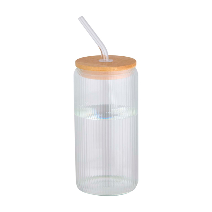 Karaffe aus Borosilikatglas mit Trinkhalm aus Glas und Bambusdeckel, gedacht für den täglichen Einsatz im Büro oder als Firmengeschenk. Die geriffelte Innenseite sorgt für ein besonderes Detail, ohne die Reinigung zu erschweren, während die glatte Außenseite eine angenehme Fläche für die Personalisierung mit Logo bietet. Der Deckel hilft, das Getränk während Besprechungen oder am Schreibtisch zu schützen. Sie wird in einer Geschenkbox aus recyceltem Karton geliefert und eignet sich für interne Aktionen oder Markenveranstaltungen.