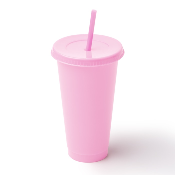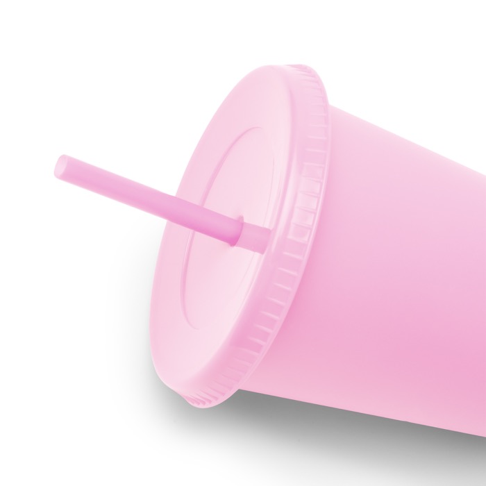 - Recycelter Kunststoff mit passend farbigem Deckel und Strohhalm