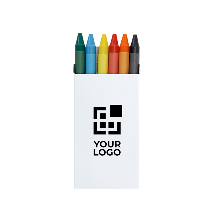 Set mit 6 Wachsmalstiften in verschiedenen Farben, präsentiert in einer Weißen Schachtel aus recyceltem Karton. Kompaktes Format, damit Sie es im Büro, in Klassenräumen oder in Bereichen mit Publikumsverkehr griffbereit haben. Die Schachtel bietet eine geeignete Fläche für den Digitaldruck. So können Sie Ihr Logo, eine Botschaft oder eine Grafik in Vollfarbe mit gutem Detailgrad anbringen. Eine einfache Lösung für Markenaktionen für Familien, Bildungskampagnen, Veranstaltungen mit Aktivitäten und Unternehmens-Werbeartikel für Messen.