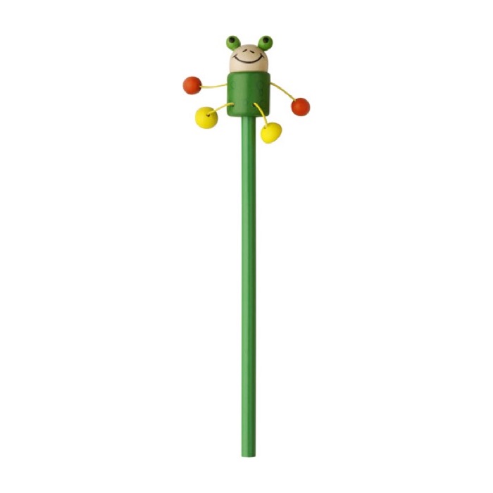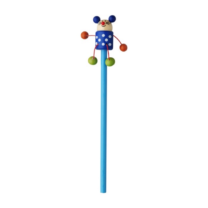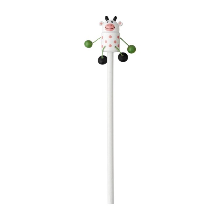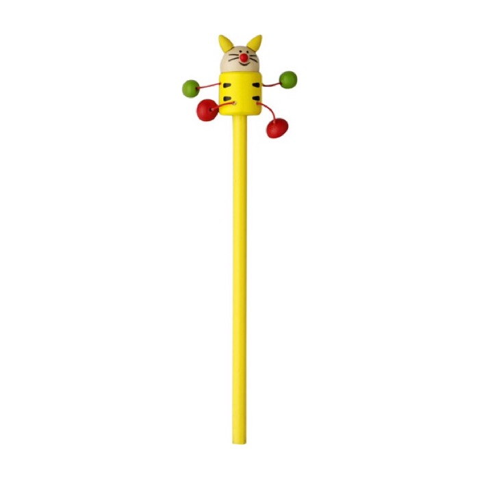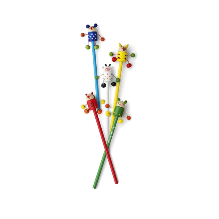Holzbleistift ohne Spitze, mit Tierfigur (Tiger, Marienkäfer, Maus, Frosch, Kuh) oben, Arme und Beine beweglich. 50 Stück pro Box (10 pro Modell). Preis pro Stück