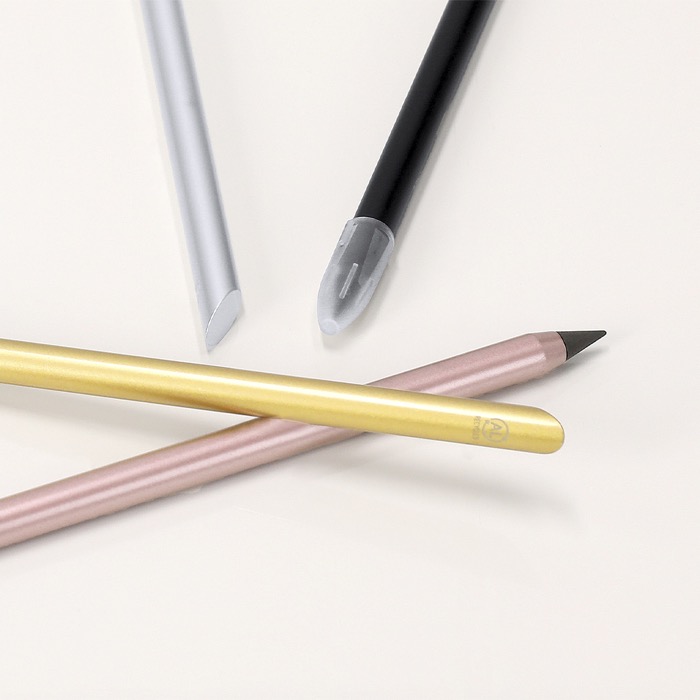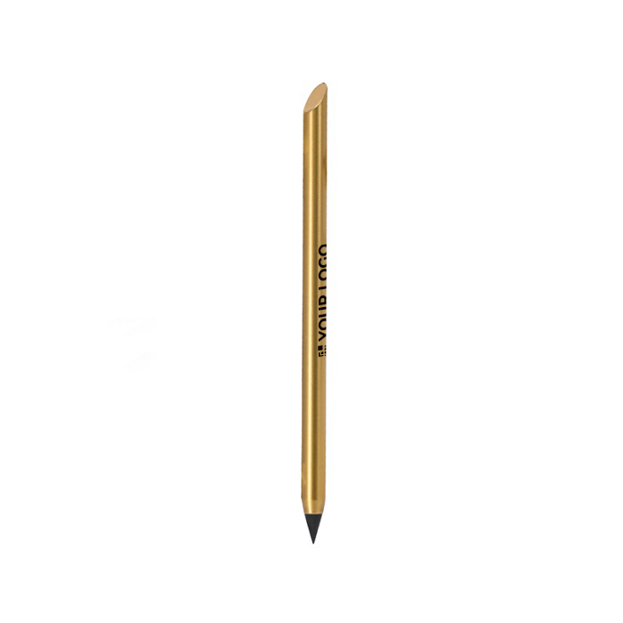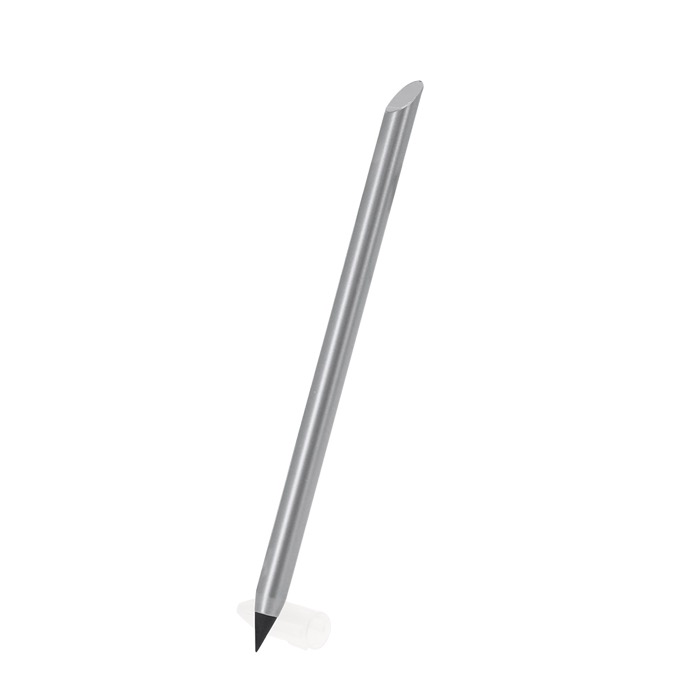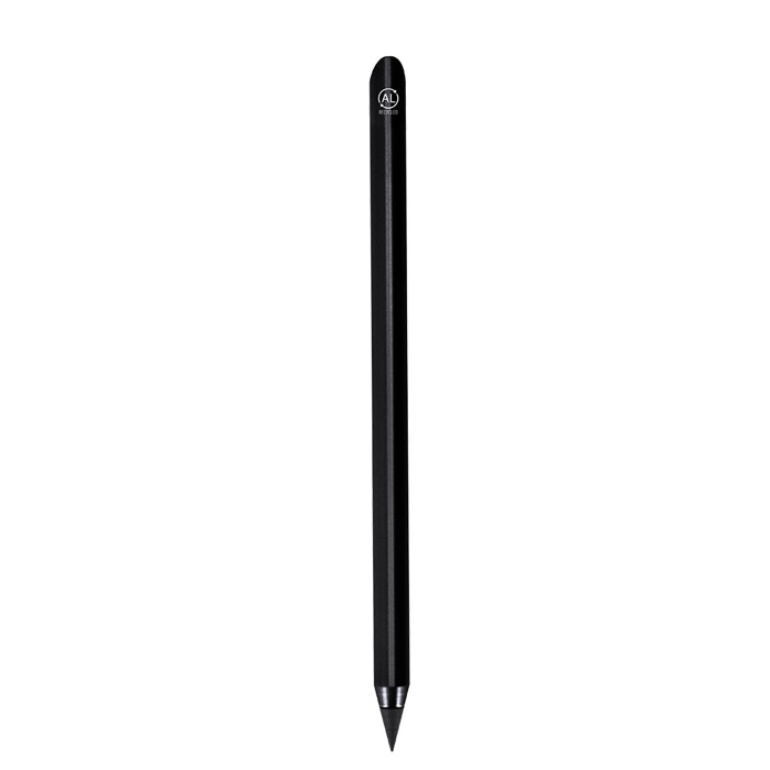 Ewiger Bleistift aus recyceltem Aluminium. Wiederverwendbar mit endloser Schreibfunktion, um Abfall zu vermeiden. Mit Kennzeichnung für recyceltes Aluminium an der Oberseite und Schutzkappe zur Abdeckung der Graphitspitze.