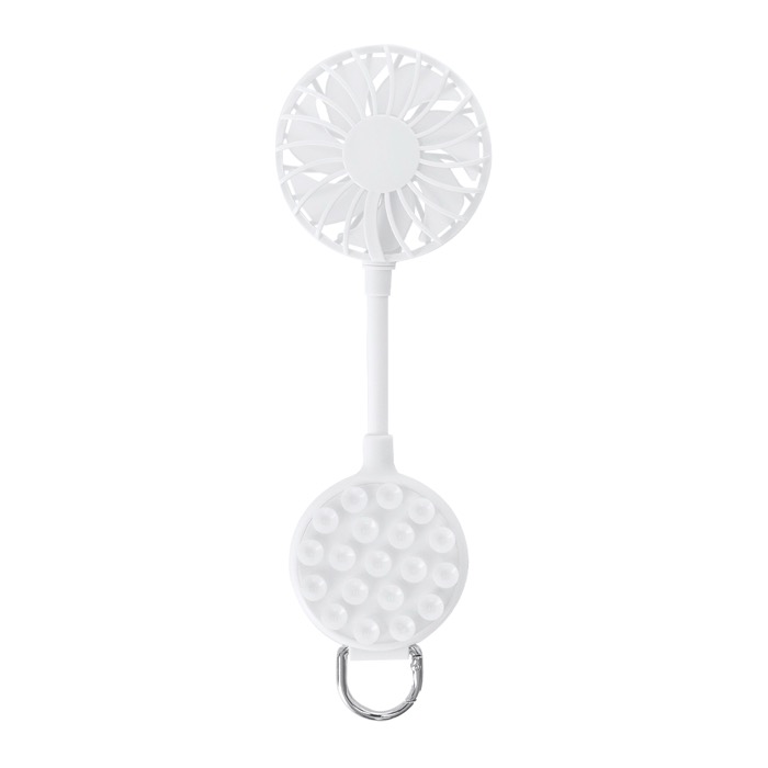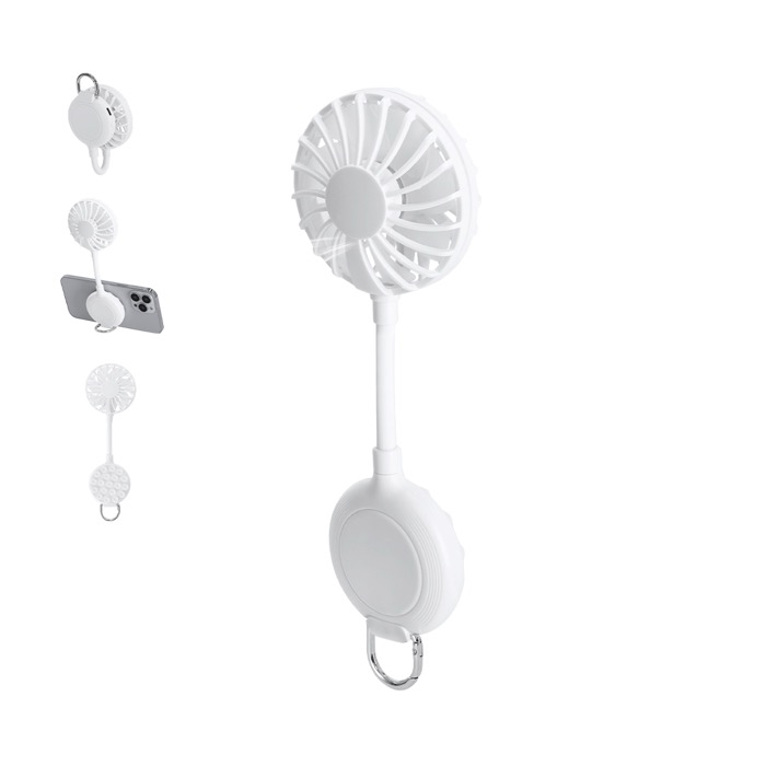 Mehrpositionsventilator aus Kunststoff in Uni-Farbe, mit 360°-Drehung, um den Luftstrom je nach Situation auszurichten. Mit Saugnapf zur Handybefestigung und verstellbarem Ständer, damit das Gerät stabil auf dem Tisch oder auf glatten Oberflächen steht. Mit 3 per Taste einstellbaren Geschwindigkeiten, wiederaufladbarem Akku und passendem Ladekabel USB A auf USB C. Am Sockel befindet sich ein Karabiner mit Metallring zum Anhängen. Nützlich für Markenaktionen bei Veranstaltungen und im Büro.