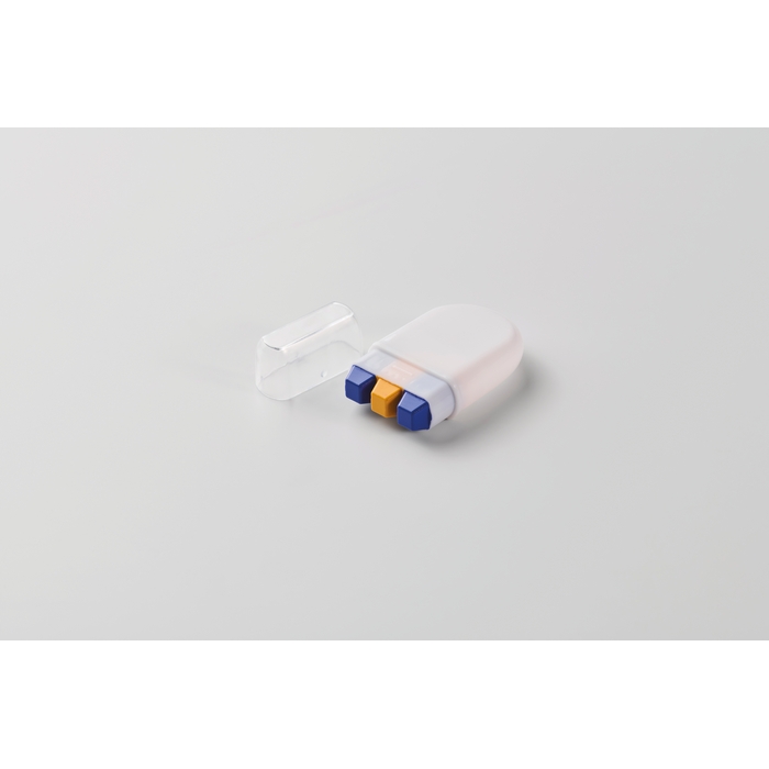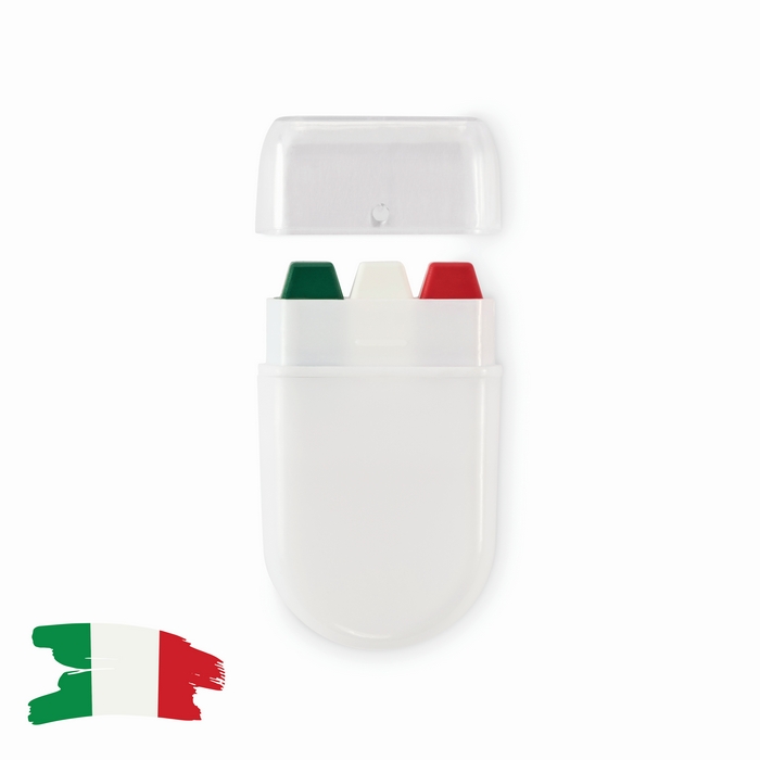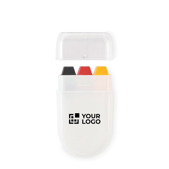 Körpermalstift mit Farben nationaler Flaggen und wachsbasierter Farbzusammensetzung, präsentiert in einem Kunststoffetui. Kompaktes, sauberes Format zum Mitnehmen in der Tasche, im Rucksack oder im Event-Kit. Das Gehäuse schützt den Stift und ermöglicht ein schnelles Auftragen auf die Haut, mit Verschluss durch Kappe zur Aufbewahrung nach dem Gebrauch. Praktische Option für punktuelle Aktionen im Freien oder in Innenräumen. Empfohlen für Event-Animation, Messen, sportliche Promotionen oder thematische Marken-Kampagnen.