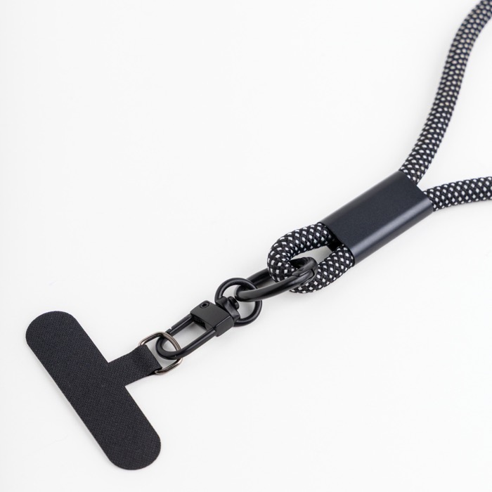 Mit Schnellladetechnologie (2 USB-C) kombiniert es Widerstandsfähigkeit und Funktionalität aus PVC, Nylon und Metallelementen. Entworfen als 42 cm langes Handgelenk-Lanyard mit robustem Schwarz-Weiß-Gewebe und drei verstellbaren Schlaufen, die Ihr Smartphone sicher halten. Ermöglicht Laden und Datentransfer – perfekt für alle, die praktische Lösungen im Alltag schätzen.