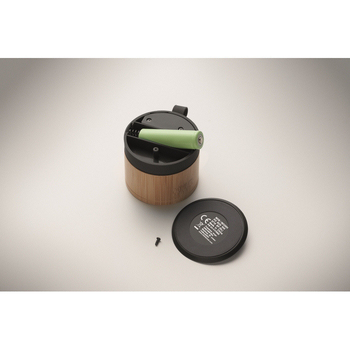 Kabelloser Lautsprecher mit Bambusgehäuse und ABS-Basis, konzipiert für eine einfache tägliche Nutzung im Büro oder unterwegs. Er bietet eine Mono-Soundausgabe von 3 W und ein kompaktes Format, das wenig Platz auf dem Schreibtisch einnimmt. Er verfügt über einen wiederaufladbaren und austauschbaren 500-mAh-Akku, der dazu beiträgt, die Lebensdauer des Produkts zu verlängern und die Wartung zu erleichtern. Eine praktische Option für Willkommenspakete, Eventgeschenke oder Markenaktionen auf Messen.