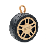 5.3 wireless Lautsprecher (3W) in Optik eines Autoreifens. Recyceltes ABS mit Details aus Bambus. Handschlaufe aus Baumwolle. Inkl. 1 wiederaufladbare 300-mAh-Batterie.