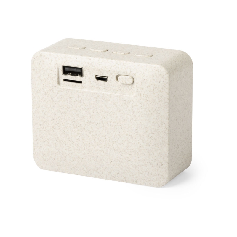 Naturlinie, Bluetooth® 5.0-Dockinglautsprecher. Schale aus Weizenstroh, um die Verwendung natürlicher Rohstoffe zu fördern und Schadstoffemissionen zu reduzieren, mit 3 W Schalleistung, mit USB-Player. Kompatibel mit iOS und Android, mit einem Mikro-USB-Ladekabel und in einer individuellen Öko-Design-Box. Mit rutschfesten Gummis an der Unterseite.