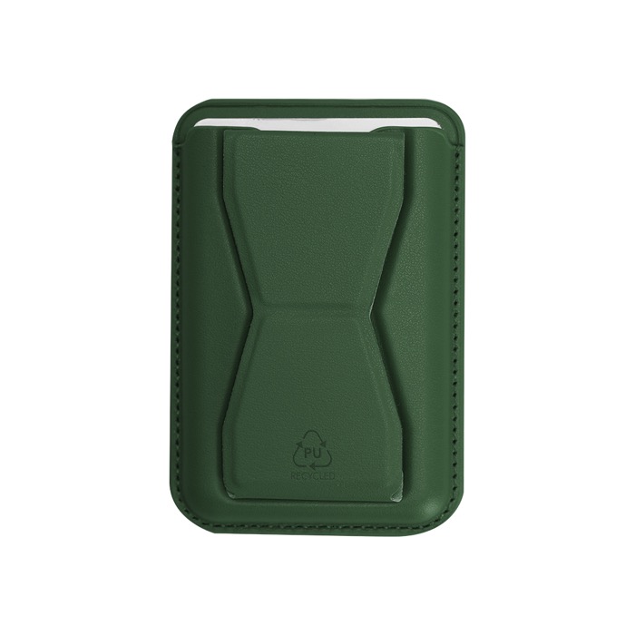 Kartenhalter-Ständer aus recyceltem Kunstleder mit schlichtem Design für den täglichen Einsatz im Büro oder unterwegs. Enthält einen multifunktionalen Ständer, mit dem Sie das Smartphone in verschiedenen Positionen aufstellen können. Das erleichtert Videogespräche, Lesen oder freihändiges Arbeiten. Das magnetische Befestigungssystem hilft, ihn sicher und griffbereit zu halten, und das Kennzeichen für recyceltes Material sorgt für ein dezentes, informatives Detail. Eine praktische Option für Markenaktionen auf Messen, beim Onboarding oder für Unternehmens-Merchandising.
