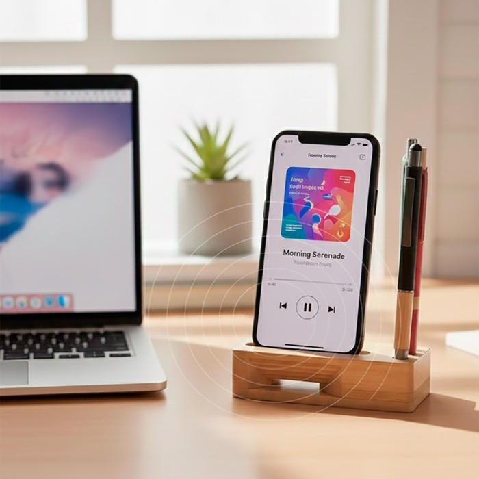 Multifunktionaler Ständer aus natürlichem Bambus mit Zertifizierung für nachhaltige Forstwirtschaft, entwickelt, um den Schreibtisch ohne Aufwand ordentlich zu halten. Er ermöglicht es, das Mobiltelefon stabil zu platzieren, sodass der Bildschirm für Videotelefonate oder Benachrichtigungen sichtbar bleibt. Er bietet Platz zur Organisation von Stiften und kleinen Accessoires und verfügt über einen Verstärkerkanal, der den Klang des Geräts auf natürliche Weise verbessert – ohne Kabel und ohne Energie. Das Design ist minimalistisch und dezent und lässt sich leicht in Büro oder Arbeitszimmer integrieren. Nützlich für Willkommensaktionen, interne Veranstaltungen oder Unternehmenswerbeartikel.