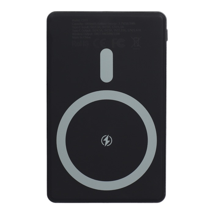 Powerbank mit 5 000 mAh, kompatibel mit MagSafe und mit kabellosem 15 Watt Laden sowie schneller Type C Ein- und Ausgangsfunktion. Besonders schlank mit nur 9,22 Millimetern und einem Gewicht von 112 Gramm, in zwei bis drei Stunden wieder aufgeladen. Hergestellt aus recyceltem ABS und inklusive 22 Zentimeter USB C Kabel.