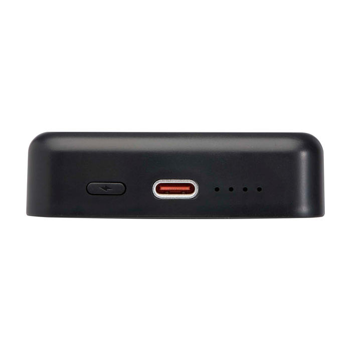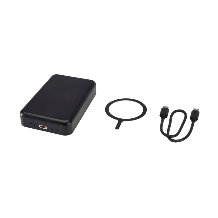 Kompakte Powerbank mit 10.000 mAh, hergestellt aus recyceltem Kunststoff, mit magnetischem, kabellosem Laden bis zu 15 W für kompatible Smartphones (einschließlich iPhone 12 und neuer). Enthält einen selbstklebenden Metallring für Geräte ohne Magnetfunktion. Unterstützt schnelles Laden über USB-C mit 20 W und ermöglicht das gleichzeitige Laden von zwei Geräten (kabellos + kabelgebunden). Mit LED-Anzeige für Lade- und Batteriestatus.
