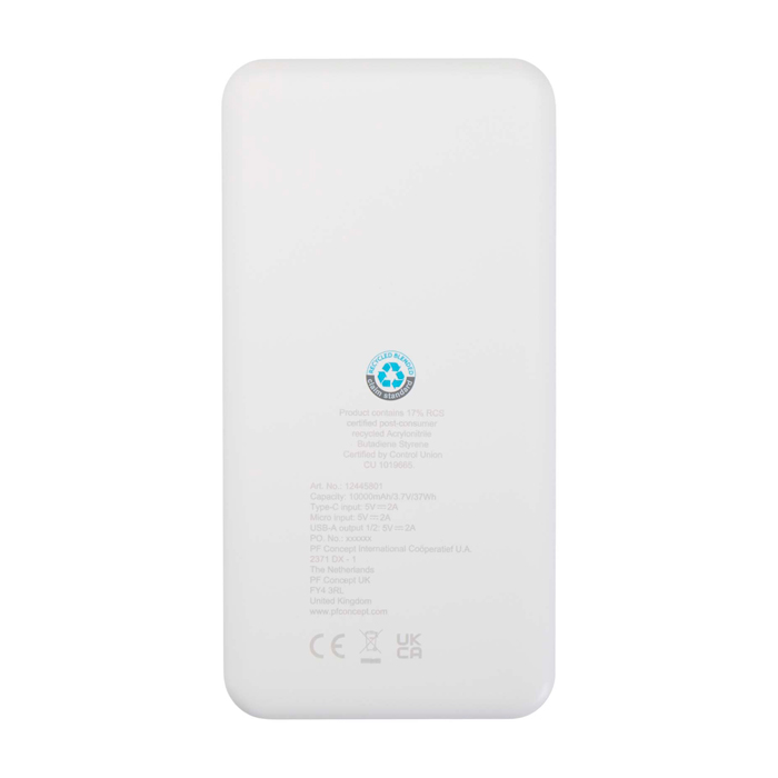 Powerbank mit 10.000 mAh, hergestellt aus recyceltem Kunststoff, mit zwei USB-A-Ausgängen, einem USB-C-Ein-/Ausgang und einem Micro-USB-Eingang für flexible Lademöglichkeiten. Ausgestattet mit einer LED-Anzeige zur Überprüfung des Ladestatus.