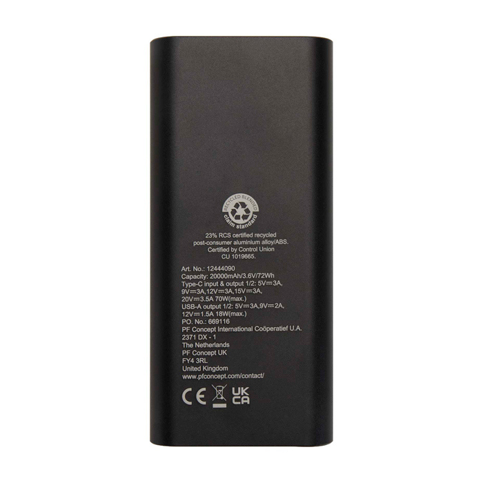 Powerbank mit 20.000 mAh Kapazität, hergestellt aus recyceltem Aluminium. Ausgestattet mit zwei USB-C-Anschlüssen (70 W) und zwei USB-A-Anschlüssen (18 W) – ideal zum Laden von Laptops, Tablets und Smartphones. Das integrierte Display zeigt in Echtzeit den Ladestand und die abgegebene Leistung an. Inklusive 70-W-USB-C-Kabel, das sowohl zum Aufladen der Powerbank als auch zum direkten Laden von Geräten verwendet werden kann.