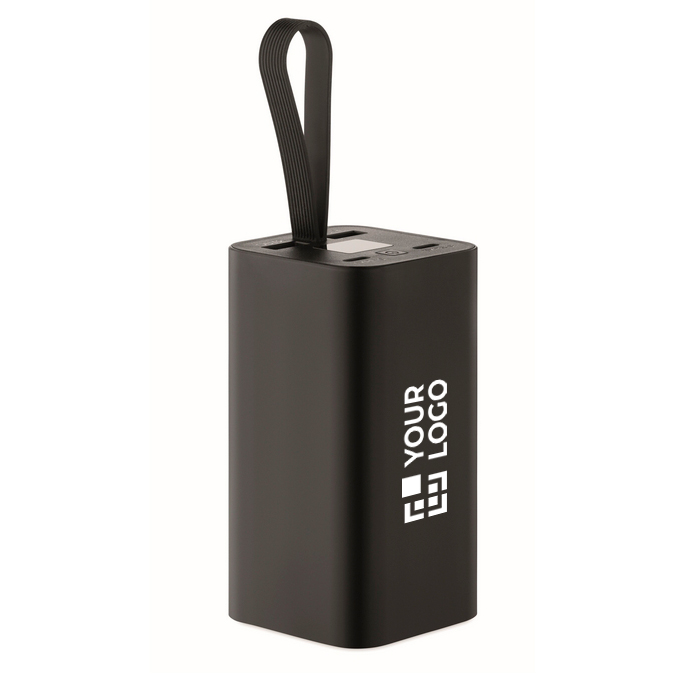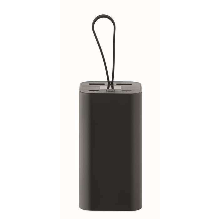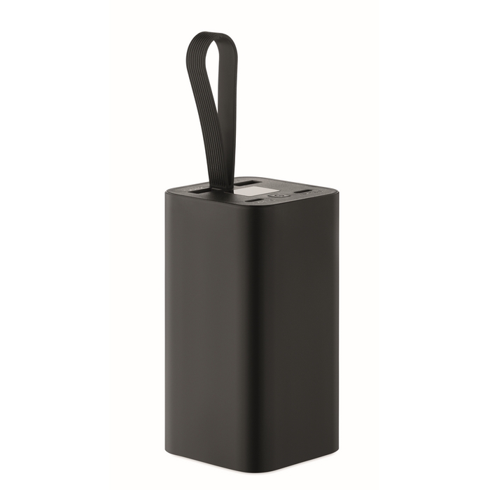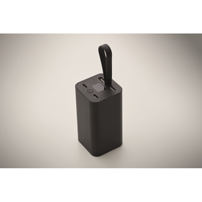 Powerbank aus recyceltem Aluminium mit digitalem Display, um den Ladezustand auf einen Blick zu prüfen, und Silikonhalterung zum Tragen am Rucksack oder zum Befestigen an einer Aktentasche. Sie verfügt über zwei USB-C- und zwei USB-A-Ausgänge, um mehrere Geräte gleichzeitig zu laden. Sie unterstützt schnelles Laden mit PD 65 W, geeignet für Smartphones, Tablets und kompatible Geräte. Empfohlen für Willkommens-Kits, Events und mobile Vertriebsteams.