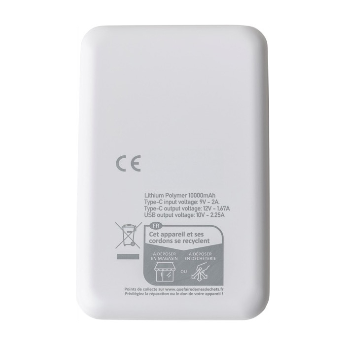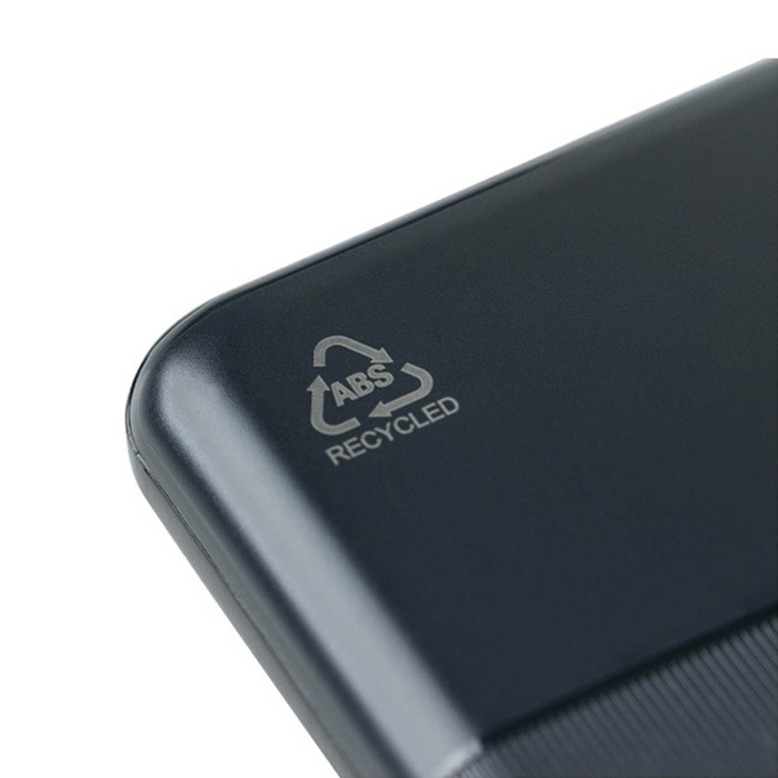 Powerbank aus recyceltem Kunststoff mit Lithium-Ionen-Akku und einer Kapazität von 10.000 mAh sowie Schnellladefunktion mit 22,5 W, ideal für intensive Arbeitstage oder Reisen. Sie verfügt über einen USB-C-Eingang und -Ausgang (USB Typ C) sowie einen USB-A-Eingang (USB Typ A) und erleichtert so die Kompatibilität mit gängigen Kabeln. Das Gehäuse kombiniert eine glatte Fläche für die Personalisierung mit einer strukturierten Oberfläche für besseren Halt. Eine digitale Anzeige zeigt den Ladestand auf einen Blick, und integrierte Schutzsysteme verhindern Überhitzung, Kurzschluss und Überladung. Lieferung in Einzelverpackung, geeignet für Unternehmensaktionen und Veranstaltungen.
