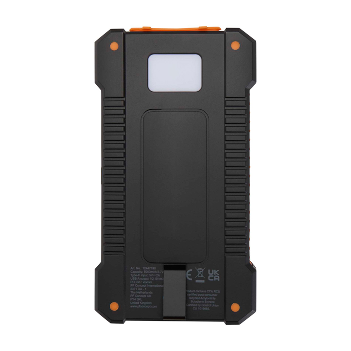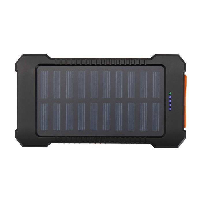 5.000 mAh Powerbank mit Solarladung und integrierter Taschenlampe, ideal für Outdoor-Abenteuer, mehrere USB-Anschlüsse für einfache Verbindung.