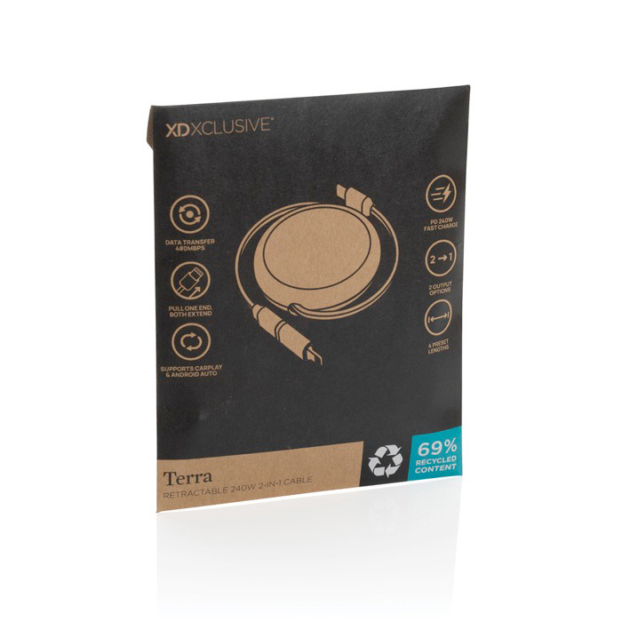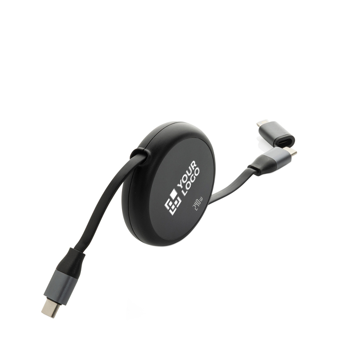Retraktbares Kabel aus recyceltem Aluminium mit Komponenten aus Kunststoff und Gummi. Entwickelt für schnelles Laden und den täglichen Einsatz unterwegs. Es verfügt über einen USB C Eingang sowie einen doppelten Ausgang USB C und iOS und unterstützt Leistungen von bis zu 240 W für Geräte vom Smartphone bis zum Laptop. Der Einzugsmechanismus lässt sich auf einer Seite ausziehen und bietet vier wählbare Längen, damit Schreibtisch oder Auto ordentlich bleiben. Datensynchronisation bis 480 Mbps sowie Kompatibilität mit CarPlay und Android Auto. Empfohlen für Marketingaktionen und die Ausstattung von Unternehmen.