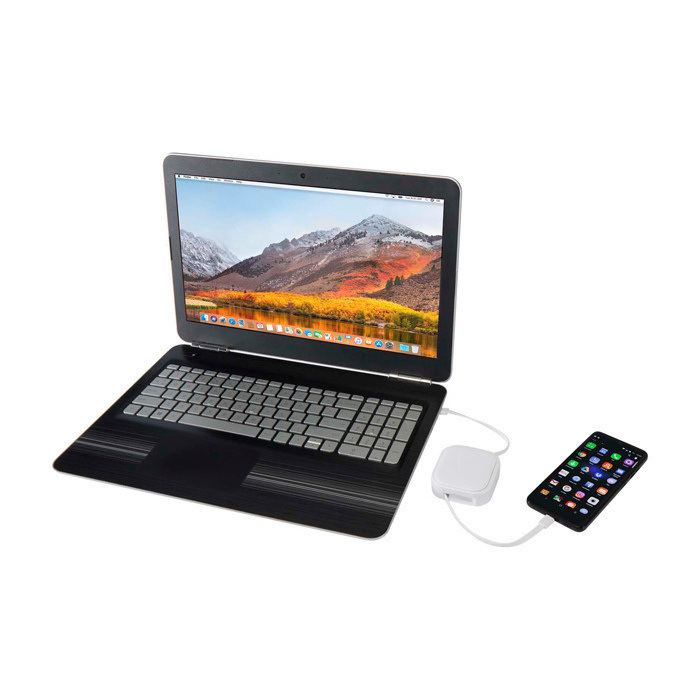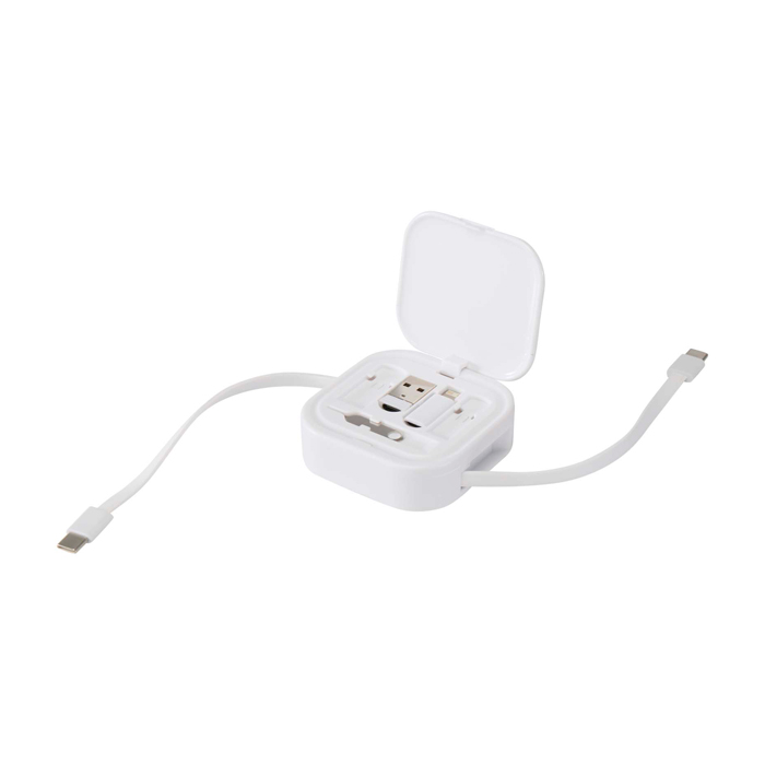 Multifunktionswerkzeug und Ladegerät, gefertigt aus recyceltem Kunststoff, mit ausziehbarem USB-C-Kabel für schnelles Laden und Datenübertragung mit bis zu 100 W. Enthält einen USB-A-Adapter sowie einen 2-in-1-Micro-USB-/Lightning-Adapter, leistungsstark genug zum Laden von Laptops, Tablets und Smartphones. Kompatibel mit CarPlay und Android Auto. Integriert sind zudem ein SIM-Auswurfstift, Fächer für eine SIM- und eine microSD-Karte sowie ein integrierter Handyhalter für Videotelefonie oder Medienwiedergabe. Kompaktes, praktisches Design – perfekt für unterwegs.