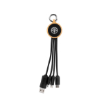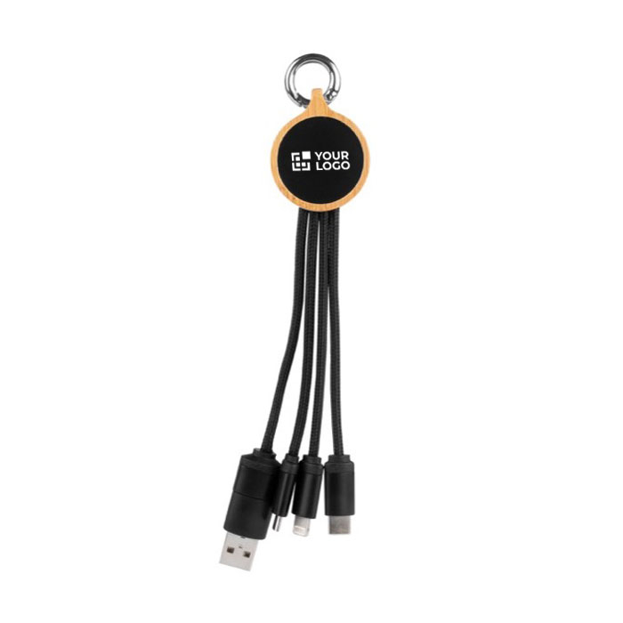 Ladekabel aus Bambus mit spezieller Oberfläche für Lasergravur mit hintergrundbeleuchtetem Logo. Mit USB- und Typ-C-Eingangsanschlüssen und Typ-C-, Lightning- und Micro-USB-Ausgängen.