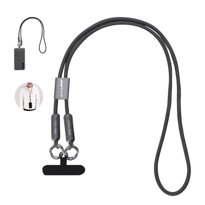 Lanyard-Ladekabel mit Datenübertragungsfunktion und Smartphone-Halterung. Mit Typ-C-Ein-/Ausgang und 60W Leistung für Schnellladung. Kombination aus Funktionalität und Komfort.