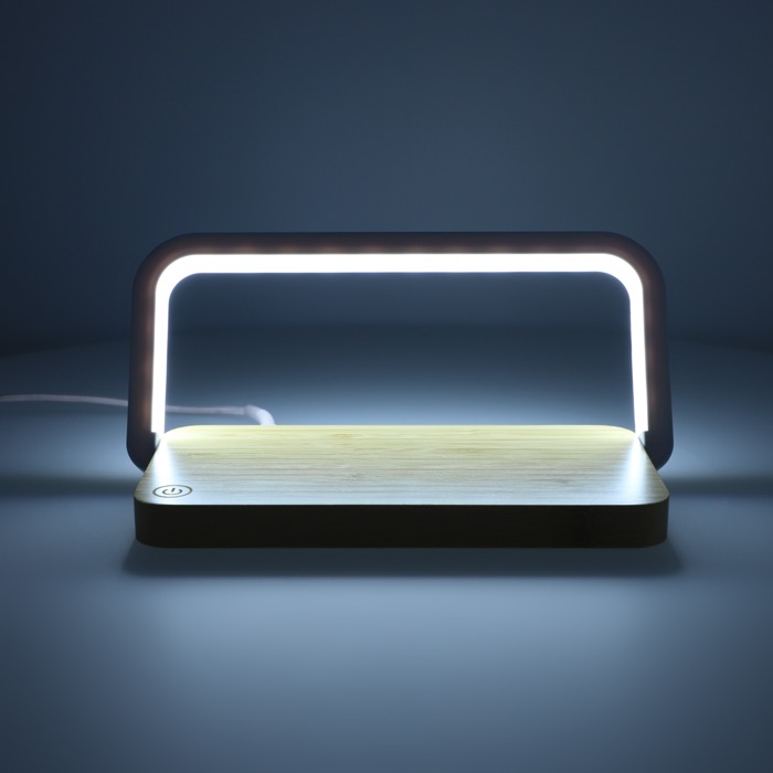 15-Watt Wireless Charger mit schneller Ladeleistung und integrierter dimmbarer LED-Leuchte, die den Arbeitsplatz funktional und inspirierend erweitert.