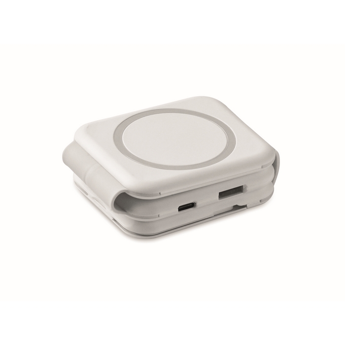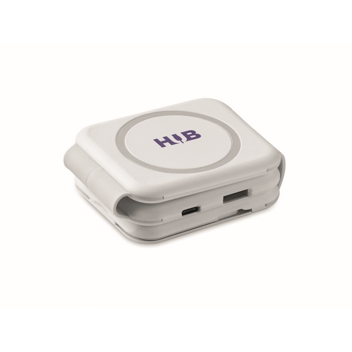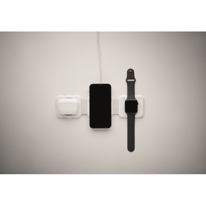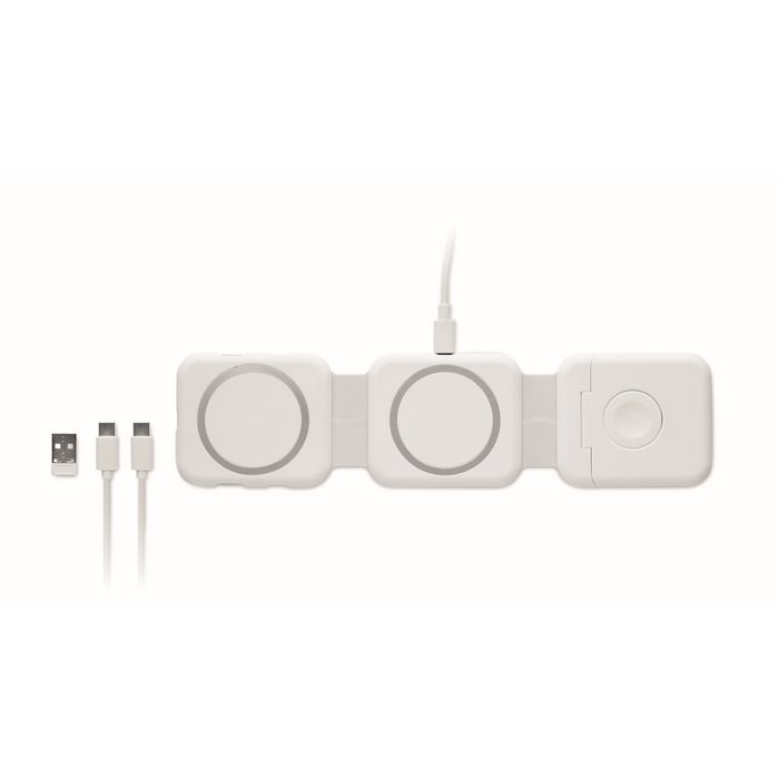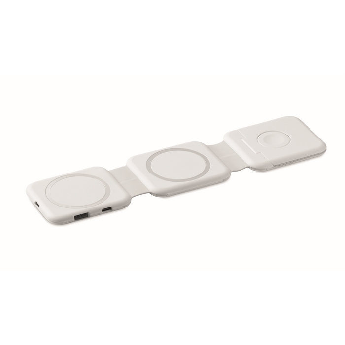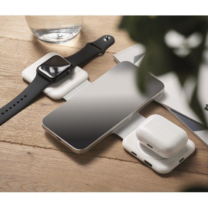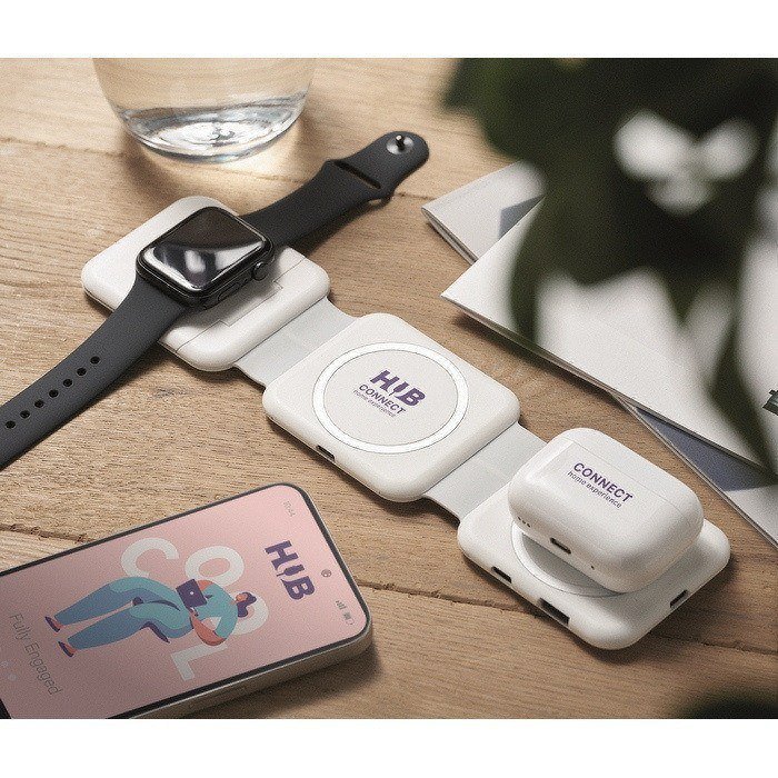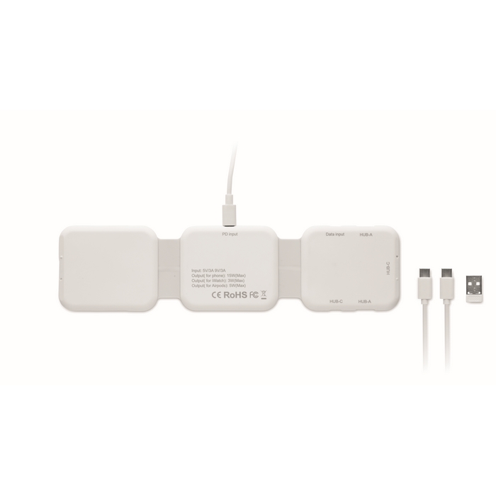 Magnetische Ladestation aus ABS mit drei kabellosen Ladepunkten, um den Schreibtisch zu organisieren und Kabel zu reduzieren. Enthält ein 15-W-Ladegerät für Smartphones, eine 5-W-Zone für TWS (true wireless stereo) und ein 3-W-Ladegerät für die Apple Watch. Zusätzlich integriert sie 2 Type-C-Hubs und 2 USB-A-Anschlüsse zum Verbinden von Zubehör. Der Kabeleingang ist integriert mit einem Type-C-auf-USB-A-Stecker. Ideal für Willkommenssets oder Besprechungsräume.