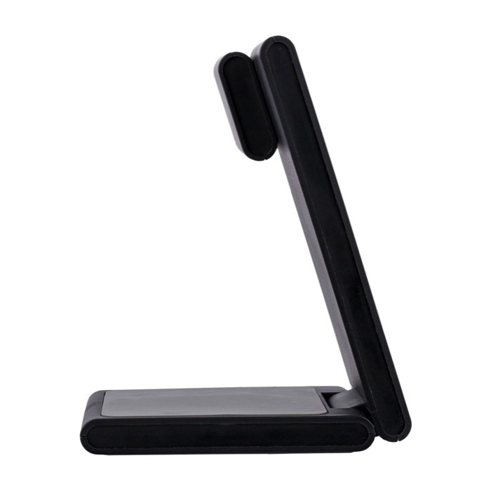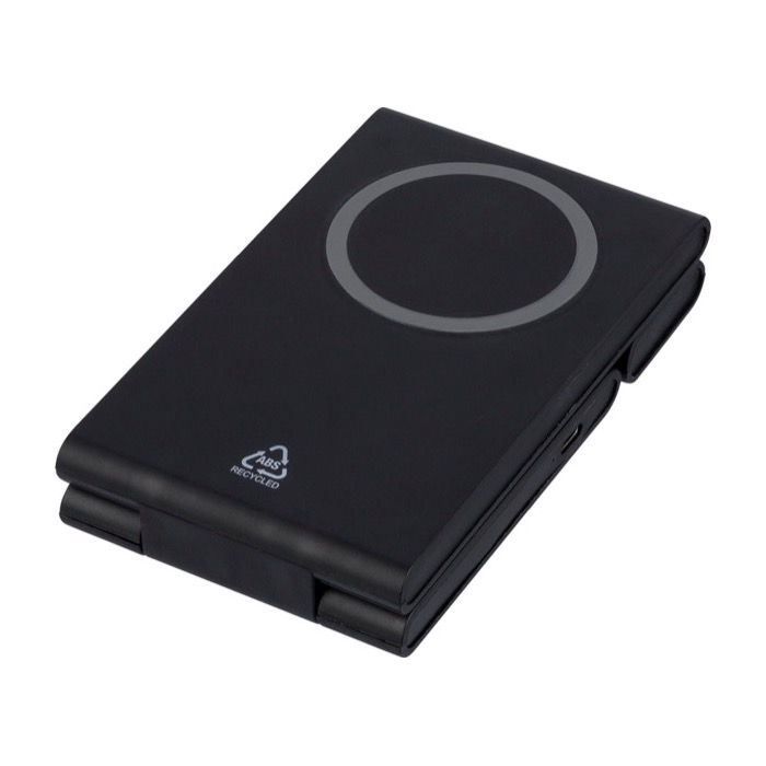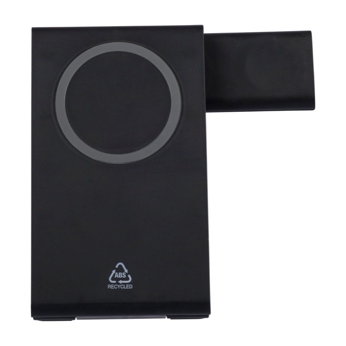 Wireless-Ladestation aus recyceltem Kunststoff mit magnetischem 3-in-1-System für Smartphone, Smartwatch und Kopfhörer. Sie bietet ein ultraflaches Design, das wenig Platz benötigt, sowie einen klappbaren Ständer, damit Sie das Smartphone während des Ladens in Leseposition nutzen können. Sie ermöglicht Laden mit bis zu 15 W für das Smartphone, 5 W für Kopfhörer vom Typ AirPods und 2 W für iWatch, mit Eingang 5V/3A oder 9V/3A über Micro-B-Anschluss (micro-USB). Geliefert in einer einzelnen Präsentationsbox, geeignet für HR-Aktionen oder Veranstaltungen.