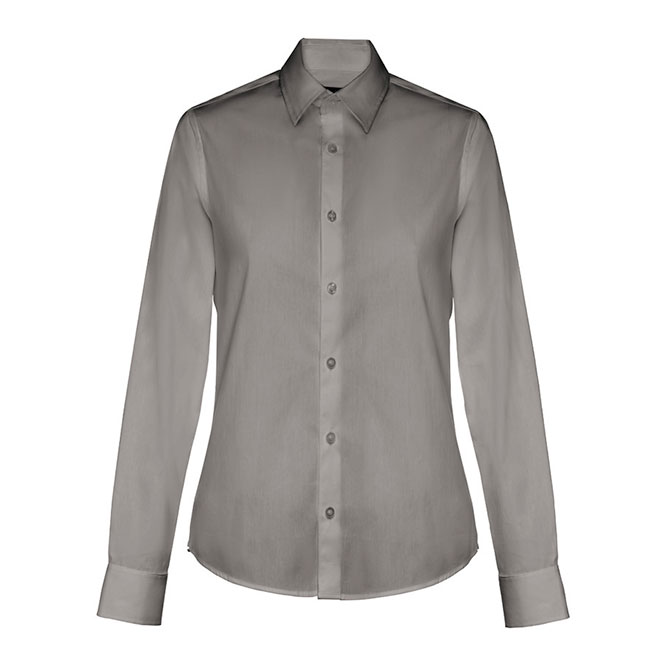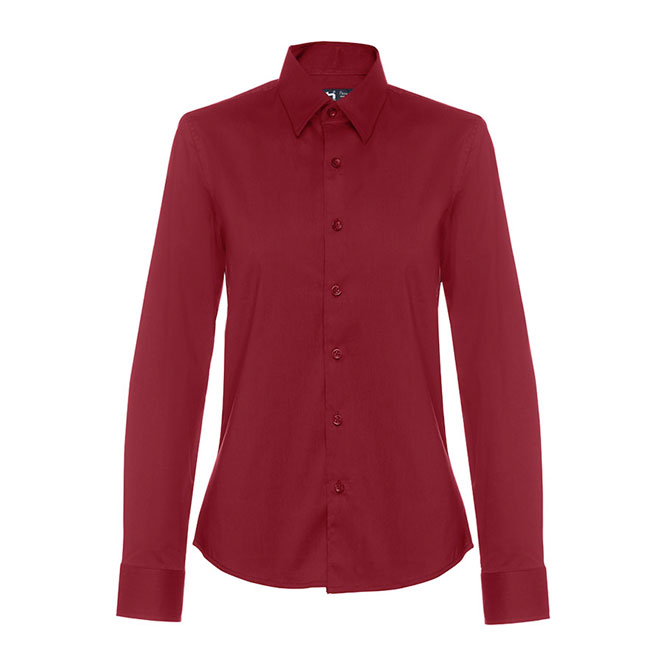 Damen Popeline Bluse mit langen Ärmeln aus 68% Baumwolle, 28% Polyamid und 4% Elasthan (115g/m2), tailliert mit verstellbaren Manschetten mit 1 Knopf, 1 Rückenfalte und 1 Knopfleiste mit 7 farblich abgestimmten Knöpfen.