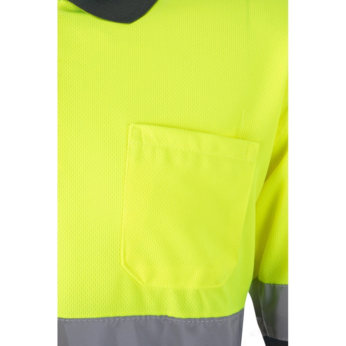Zweifarbiges Poloshirt im Bird-Eye-Design (160g/m2) mit langen Ärmeln, aus Polyester (100%). Knöpfe in Kontrastfarbe, gerippter Kragen und Manschetten ebenfalls in Kontrastfarbe. Reflektierende Streifen auf dem Rumpf und den Ärmeln.