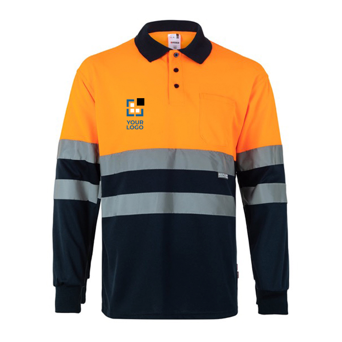 Zweifarbiges Poloshirt im Bird-Eye-Design (160g/m2) mit langen Ärmeln, aus Polyester (100%). Knöpfe in Kontrastfarbe, gerippter Kragen und Manschetten ebenfalls in Kontrastfarbe. Reflektierende Streifen auf dem Rumpf und den Ärmeln.