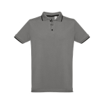 Herren Poloshirt aus Piqué Stoff 100% kardierter Baumwolle (210g/m²)," Slim Fit" mit geripptem Kragen und Ärmel. Der Kragen, die Knopfleiste und die Ärmel haben einen zweifarbigen Kontrast. Mit verstärkter Knopfleiste und 3 farblich abgestimmten Knöpfen, einem Ersatzknopf an der Innennaht und seitlichen Öffnungen.