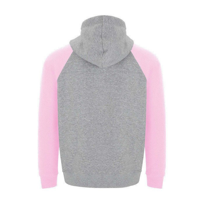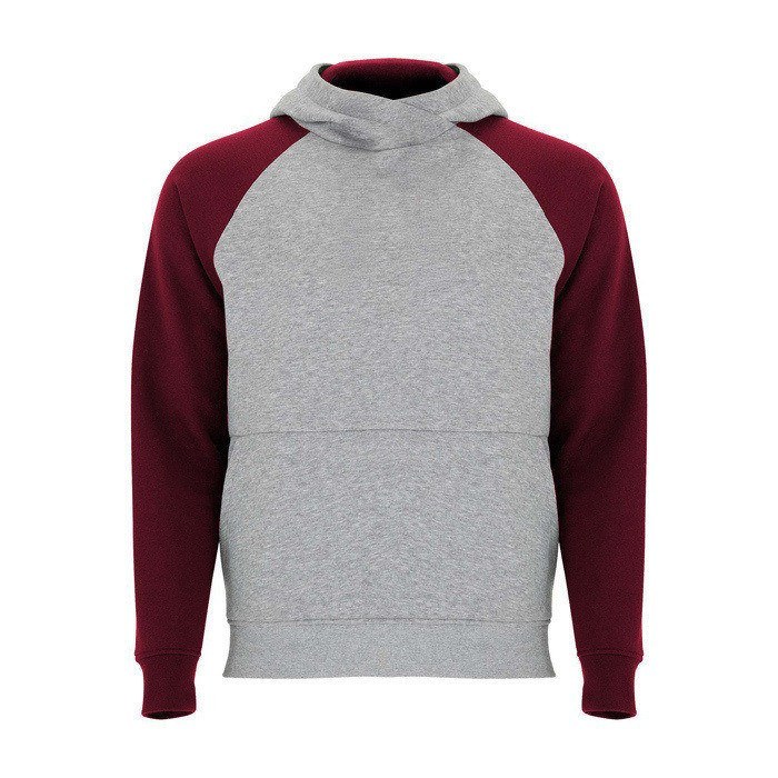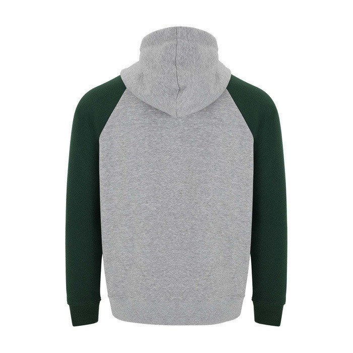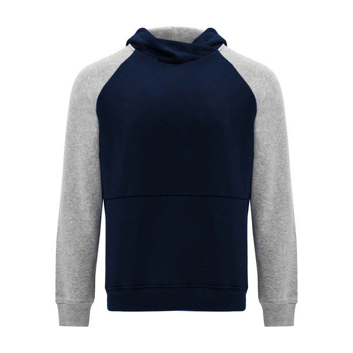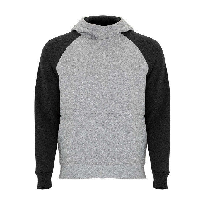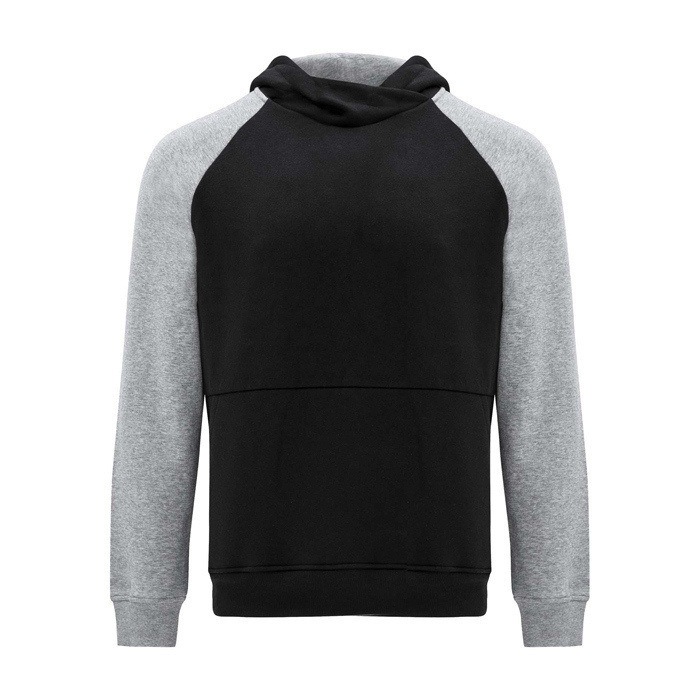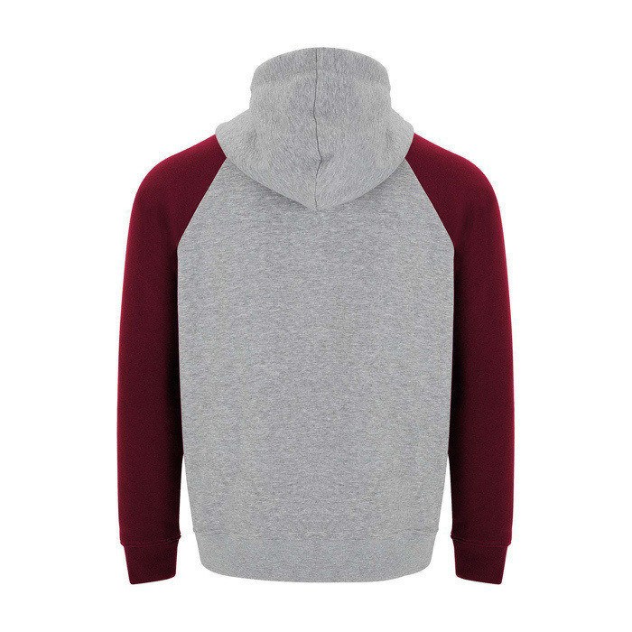 Unisex-Kapuzenpullover mit zweifarbigem Design und überkreuztem Kragen mit Metallösen. Das Kapuzeninnere und die Kordel sind farblich abgesetzt, ebenso wie die Raglanärmel. Mit Kängurutasche sowie Bündchen und Saum aus elastischem 1×1-Rippstrick. Abnehmbares Etikett.