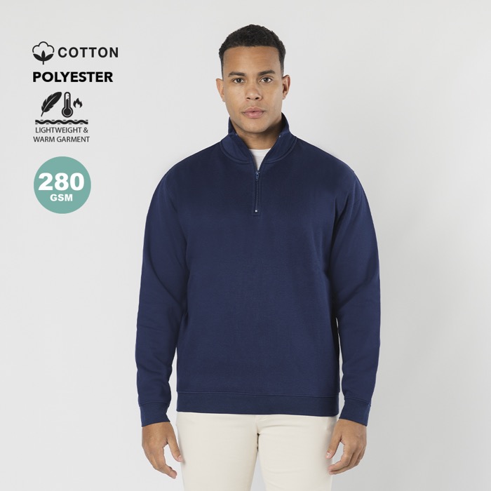 Unisex-Sweatshirt aus einem Baumwoll-Polyester-Mischgewebe, gefertigt aus weichem, angerautem Sweatstoff mit 280 g/m² für angenehmen Tragekomfort im Alltag. Es verfügt über einen farblich passenden Halb-Reißverschluss mit Zipper sowie einen doppellagig gefütterten Stehkragen, der Wärme bietet und für eine hochwertigere Optik sorgt. Bündchen und Saum aus 1x1-Rippstrick mit Elasthan helfen, die Passform langfristig zu erhalten. Seitennähte sorgen für einen gleichmäßigeren Fall. Geeignet für Arbeitskleidung, Messen und Markenaktionen mit Logo.