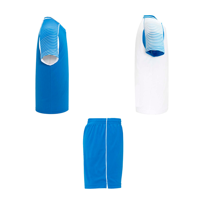 Das Set besteht aus 2 T-Shirts und 1 Paar Shorts. Die Farbe des zweiten T-Shirts ist der des ersten entgegengesetzt. Atmungsaktiver Funktionsstoff. T-Shirts mit bedruckten Halb-Raglanärmeln. Rundhalsausschnitt mit Trikotstoff auf der Rückseite. Shorts mit elastischem Bund und innenliegendem Kordelzug mit Sicherheitsnähten. Seitliches Kontrastband und Seitenschlitze am Hosenbein. Abnehmbares Etikett.