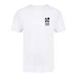 Weißes T-Shirt für Erwachsene mit Ihrem Firmenlogo oder dem Claim Ihrer Werbekampagne. Es hat ein röhrenförmiges Design mit rundem Hals.