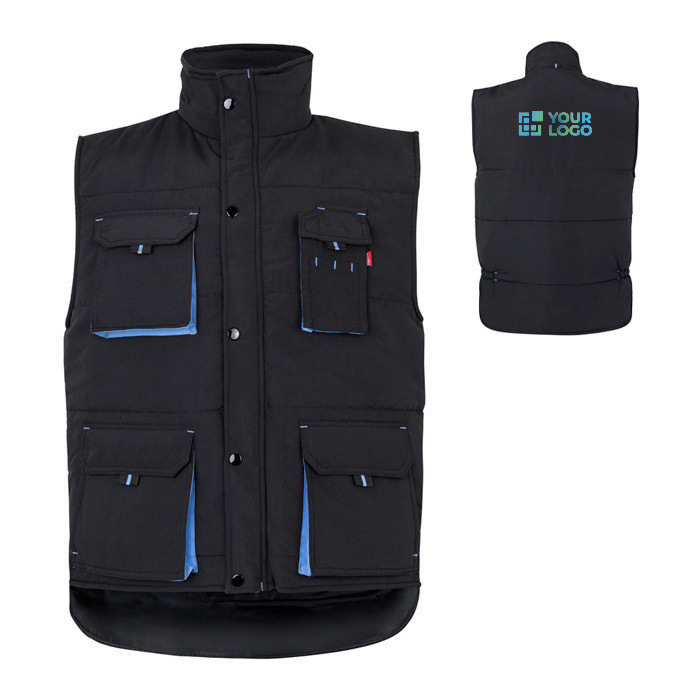 Zweifarbige Steppweste mit mehreren Taschen (120 g/m2), aus Polyester (100 %). Reißverschluss, verdeckt mit Knopfleiste. Elastischer Seitenbund, Windschutz am Armausschnitt. Mit Balg, Reißverschlüssen und Nähten in Kontrastfarbe. Enthält sieben Taschen (2 Balgtaschen auf der Brust, 2 untere Balgtaschen, 2 Seitentaschen, 1 Balgtasche auf der Brust und 1 Innentasche).
