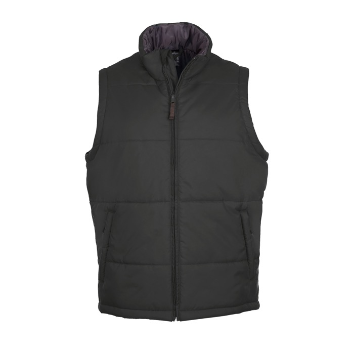 SOL'S WARM Herren-Weste. Erschwinglicher Klassiker, wasserabweisend und winddicht. Großer Druckbereich auf der Rückseite für das Logo. Durchgehender Reißverschluss, 2 Seitentaschen mit Reißverschluss, Kragen mit dunkelgrauem Kontrastdetail. Material: Außen: 210 g/m², 100 % 210T-Nylon, AC-Beschichtung, Futter aus 100 % 190T-Polyester. 190T Nylon, gepolstert mit 220 g/m² Polyestersteppung.