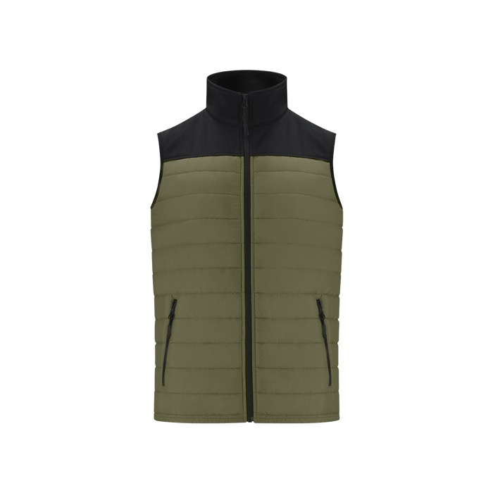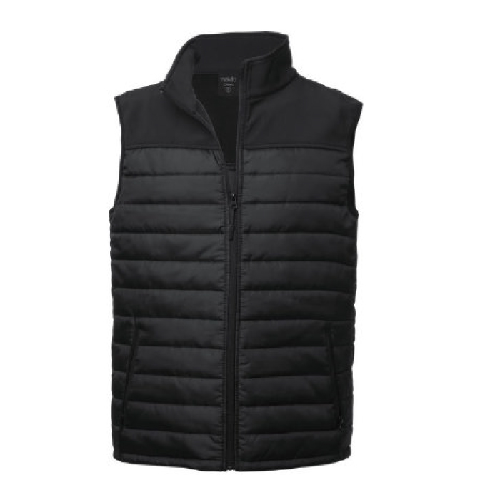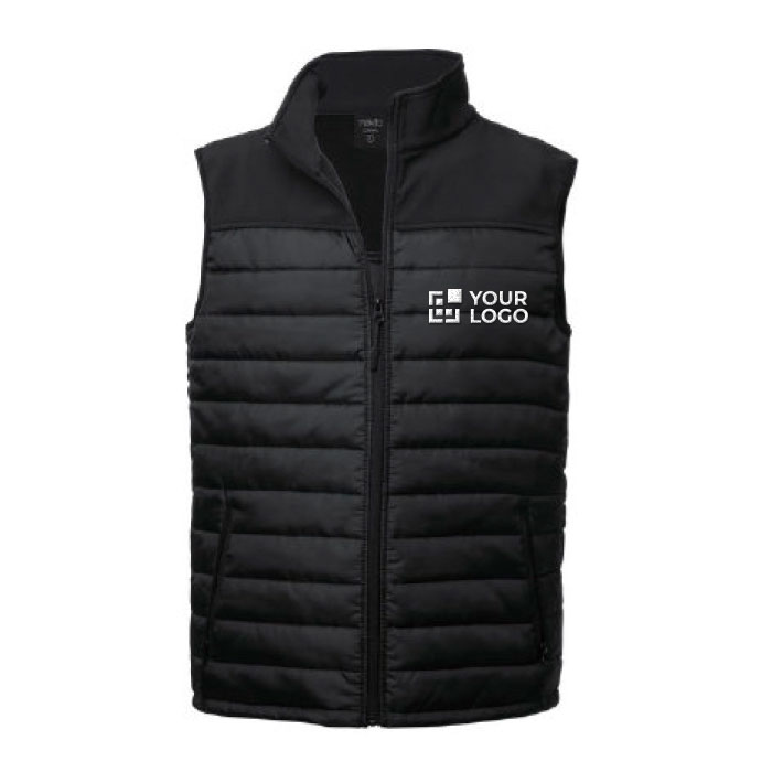 Wasserdichte und atmungsaktive Weste aus einer Kombination von Softshell- und Polyester-Materialien. Sie ist eine ausgezeichnete Wahl für Ausflüge oder sportliche Aktivitäten. Das elegante schwarze Design mit Reißverschluss und seitlichen Reißverschlusstaschen mit Zippern sorgt für ein einfaches Öffnen und Schließen. Dieses Kleidungsstück bietet einen lässigen und vielseitigen Look für den Alltag. Es ist in den Größen S bis XXL erhältlich und kann mit Ihrem Logo in mehreren Farben bedruckt werden.