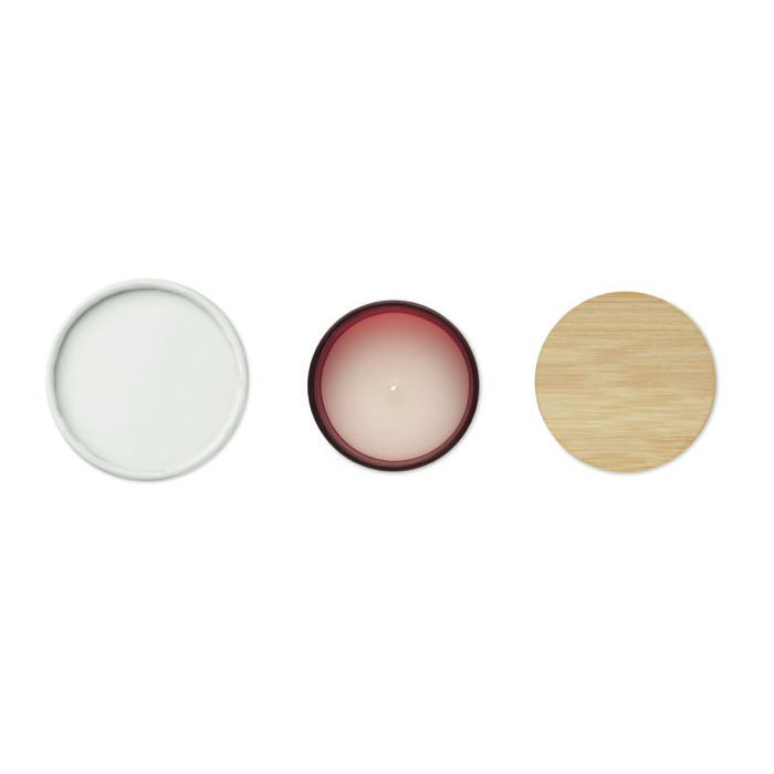 Pflanzenkerze im farbigen Glas mit Bambusdeckel als Werbegeschenk