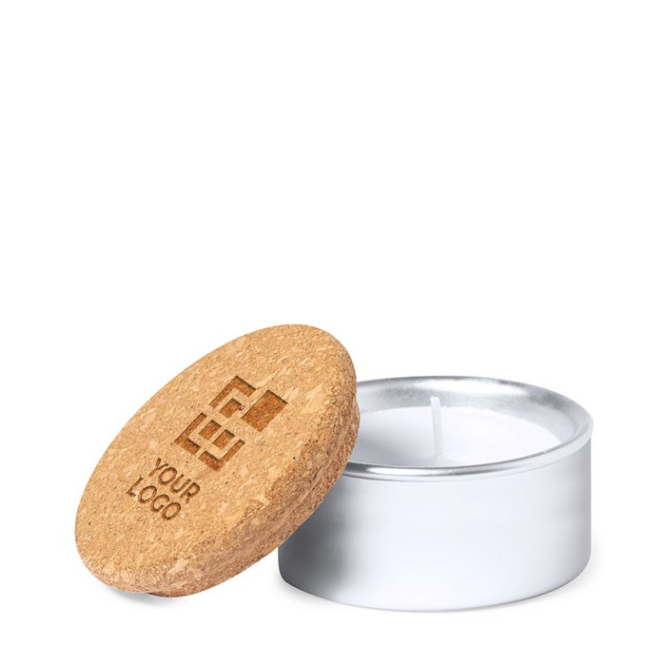 Originelle Kerze in einem Aluminiumgefäß mit Naturkorkdeckel, damit sie nicht verstaubt. Ideal zum Aufdrucken eines farbigen Logos oder Lasergravur.