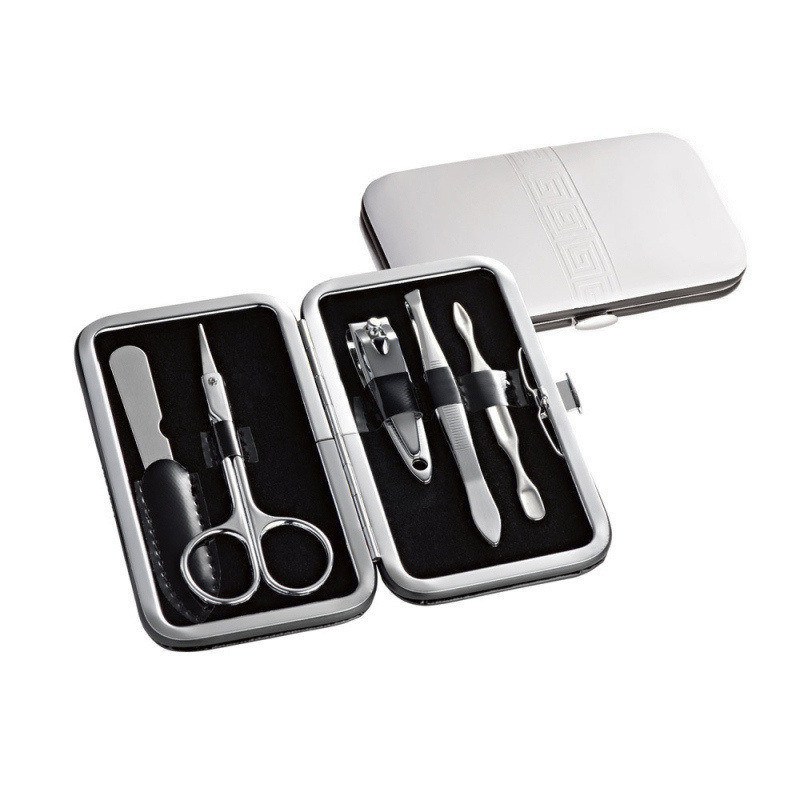 Maniküre-Set (5teilig) bestehend aus einer Nagelfeile, Nagelschere, Nagelzange, Pinzette, und einem Nagelhautschieber. Geliefert in einem Etui aus Lederimitation.