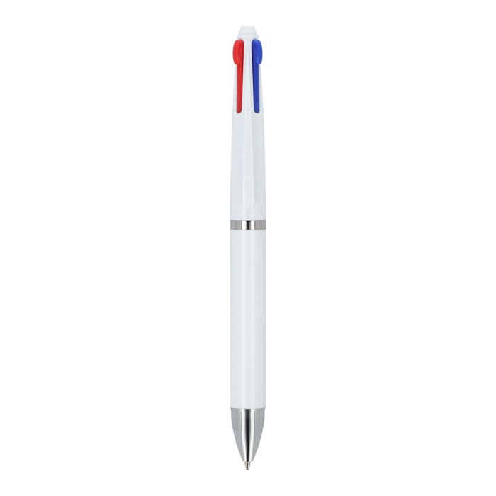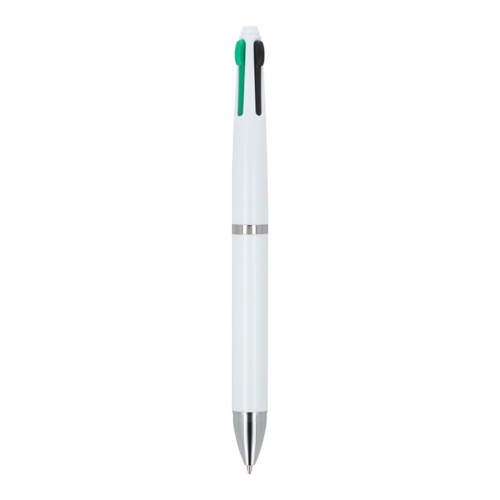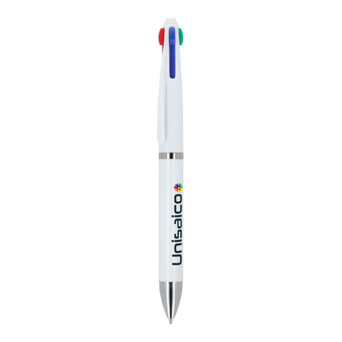 Kunststoff-Kugelschreiber im klassischen Design mit 4-Farben-Schreibsystem. Sie können mit einem einzigen Stift zwischen schwarzer, blauer, roter und grüner Tinte wechseln. So gelingen Notizen, Korrekturen und Markierungen schneller, ohne den Stift zu wechseln. Der Auswahlmechanismus ist einfach und komfortabel für den täglichen Einsatz im Büro, am Empfang oder im Kundenservice. Eine praktische Lösung für Teams, die mit Dokumenten, Besprechungen und Planung arbeiten. Empfohlen für Merchandising-Aktionen auf Messen, Kongressen und internen Schulungen.