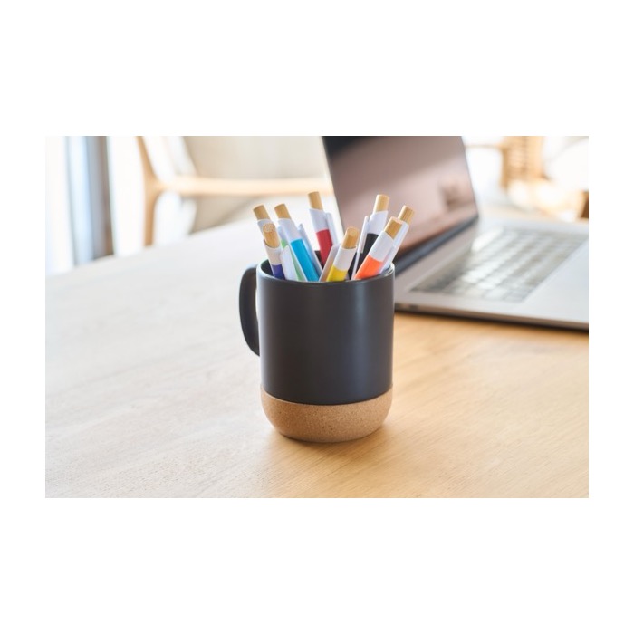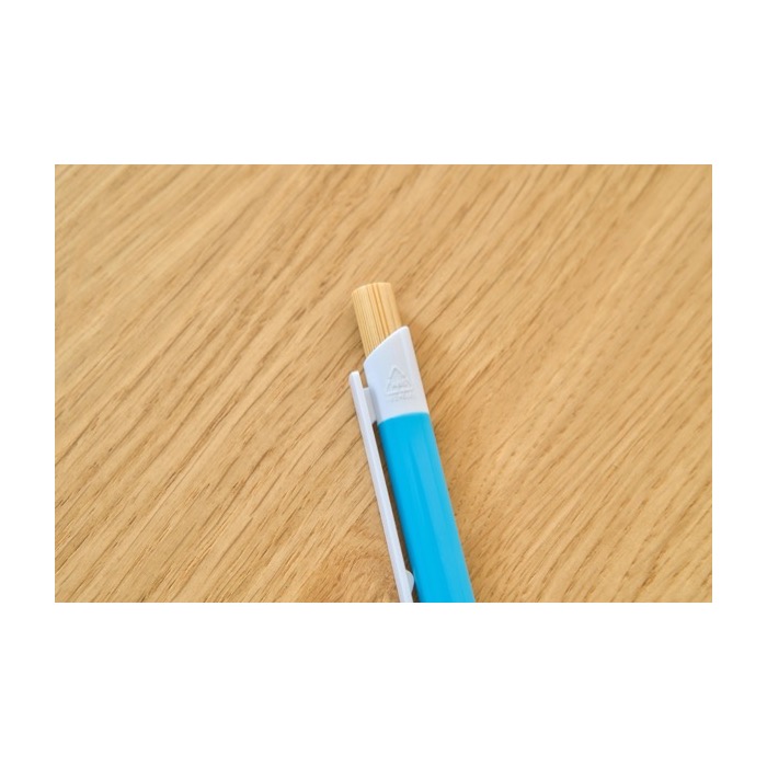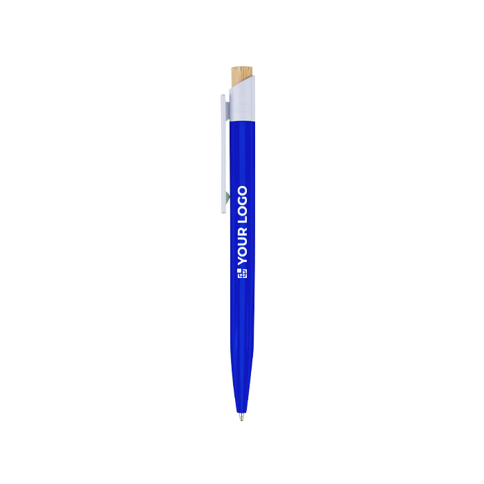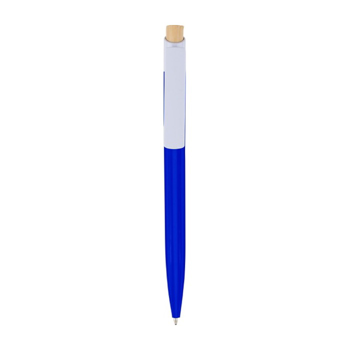 Kugelschreiber aus recyceltem Kunststoff mit Bambusdrücker und weißem Clip, entwickelt für den täglichen Einsatz im Büro, auf Messen und bei Maßnahmen zur Kundengewinnung. Er ermöglicht Digitaldruck, um das Design mit guter Detailgenauigkeit auf dem Schaft aufzubringen. Ein Recycling-Logo ist in die Form integriert und hilft, das Material auf einen Blick zu erkennen. Er bietet eine Schreibleistung von ca. 600 Metern mit blauer Tinte und eignet sich für eine große Verteilung. Empfohlen als praktischer Werbeträger zur Markenstärkung an Empfangstheken, bei Schulungen oder Firmenveranstaltungen.
