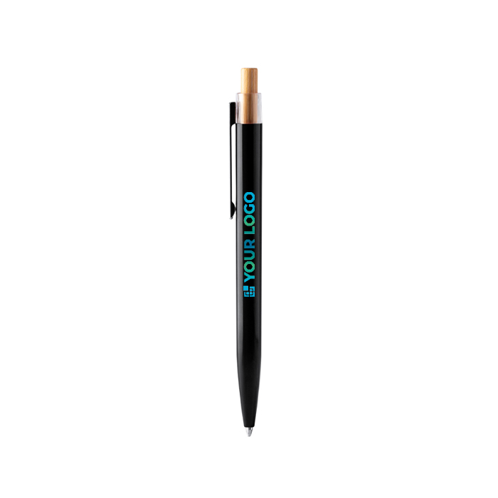 Farbiger Kugelschreiber aus recyceltem Kunststoff, ausgelegt für den täglichen Einsatz im Büro und bei Veranstaltungen. Er verfügt über einen Bambusdrücker, transparente Details zur leichteren Erkennung des Mechanismus sowie einen Metallclip zum Befestigen an Mappe, Notizbuch oder Tasche. Die Schrift ist dank der blauen Tinte angenehm flüssig und eignet sich für Unterschriften und schnelle Notizen. Durch das schlichte Design und den Materialmix passt er zu internen Kommunikationsmaßnahmen, Messen oder als praktisches Detail für Besuche und Besprechungen.