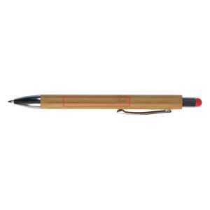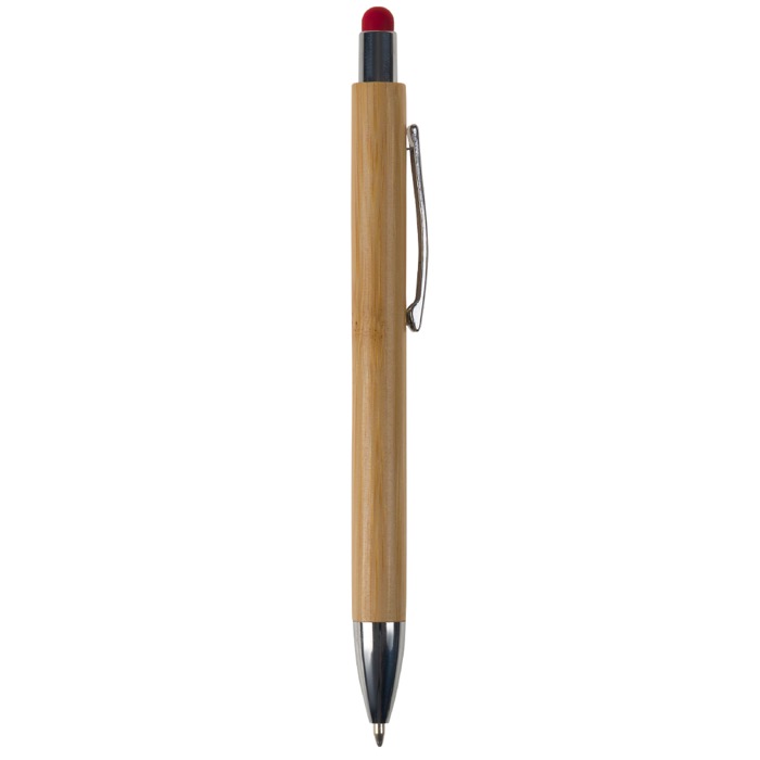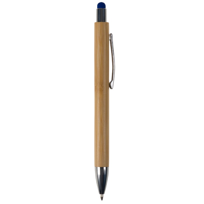 Kugelschreiber aus Bambus, inkl. metallbeschichteten Drücker und Spitze und einen Clip aus Metall. Der auf dem Drücker platzierte Touchpen, für die Bedienung von Smartphone-Displays, gibt es in sechs Farben. Inkl. einer blau schreibenden Jumbo-Mine aus Kunststoff.