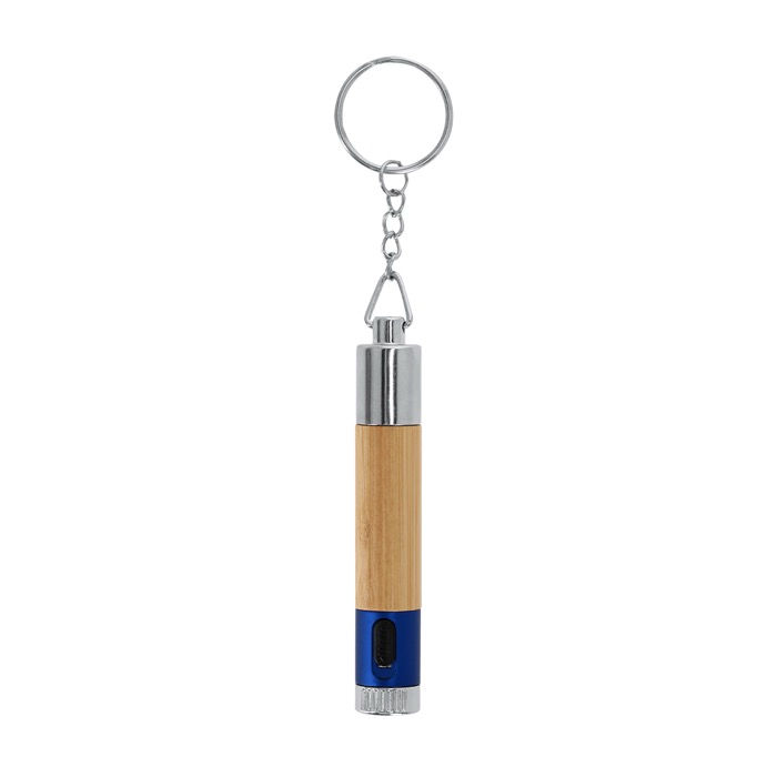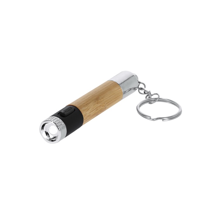 Bambus-Kugelschreiber mit integrierter LED-Taschenlampe, entwickelt, um Schreiben und punktuelles Licht im Alltag zu verbinden. Mit Kappe und verchromtem Metallring, praktisch zum Aufhängen oder zum Mitführen an Schlüsseln und Ausweisen. Die Schrift ist in blauer Tinte, geeignet für Büro- und Empfangsbereiche. Betrieb mit enthaltenen Knopfzellen, sodass er einsatzbereit ankommt. Empfohlen als Unternehmens-Give-away für Messen, Akquiseaktionen oder interne Schulungen.