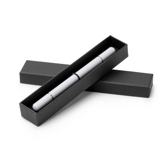 2-in-1-Kugelschreiber mit Metallgehäuse und zwei Schreiboptionen für den Büroalltag. An einem Ende befindet sich ein Kugelschreiber mit Jumbo-Mine und blauer Tinte, am anderen ein Bleistift mit endloser Spitze. Beide sind mit einer Kappe geschützt, um Flecken und Stöße zu vermeiden. Geliefert wird er in einem schwarzen Einzel-Etui mit Innenpolsterung, geeignet für eine hochwertige Übergabe bei Meetings oder Schulungen. Eine praktische Lösung für Markenaktionen auf Messen, Veranstaltungen und zur Begrüßung neuer Mitarbeitender.