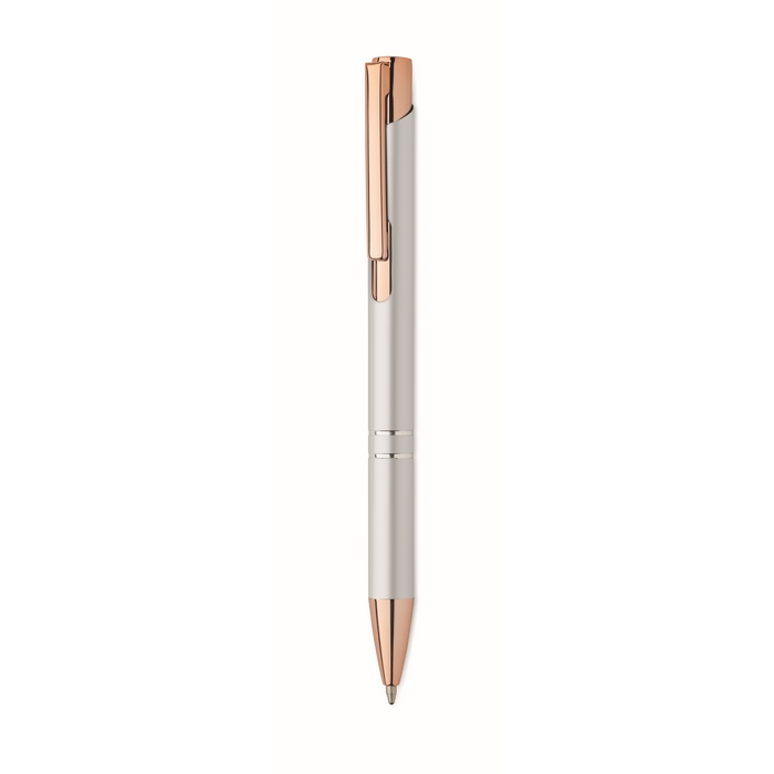 Druckkugelschreiber aus recyceltem Aluminium mit rosé goldenen Details. Blaue Tinte.