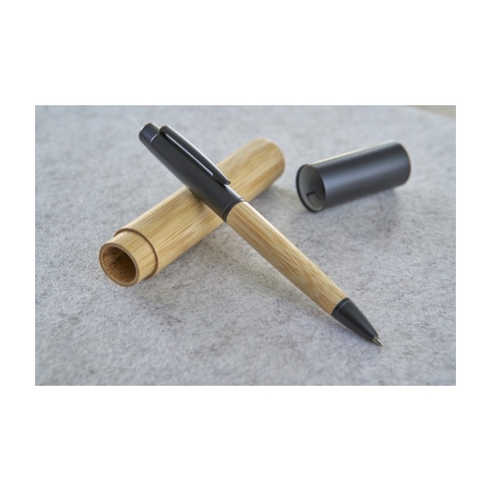 Drehkugelschreiber aus Edelstahl mit Bambusgriff in einer Verpackung aus Bambus und Aluminium. Mit blauer aufladbarer Metallmine. Einzeln verpackt in brauner Pappschachtel.