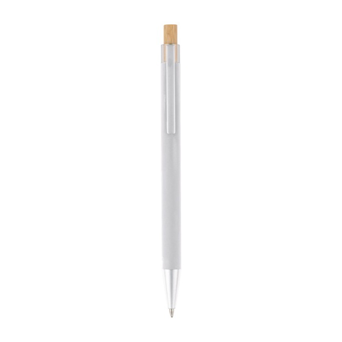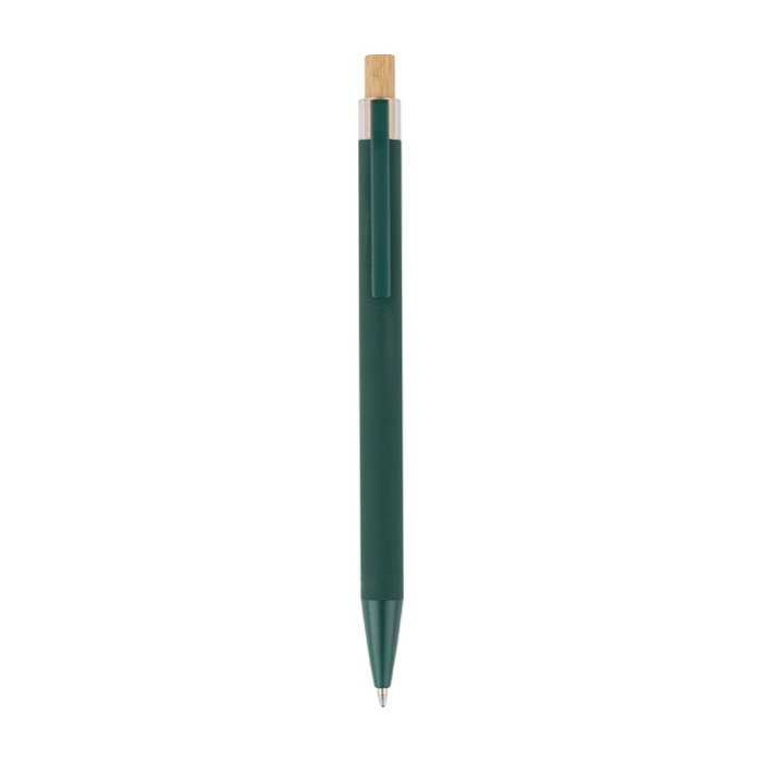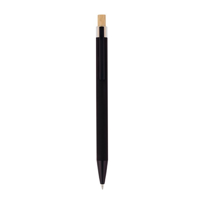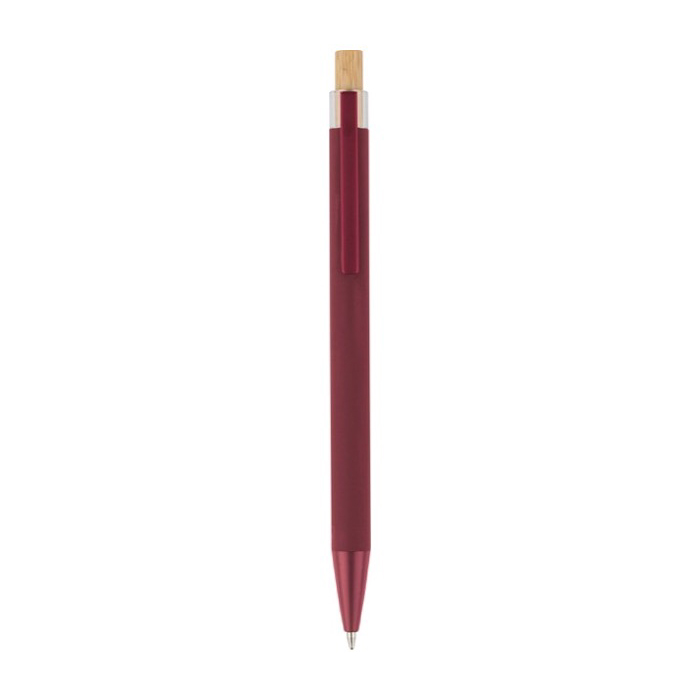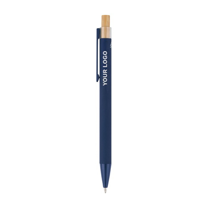 Kugelschreiber aus recyceltem Aluminium mit Bambusdrücker und Kunststoffdetails (AS, Acrylnitril-Styrol). Mit Metallclip und passender Kunststoffspitze für eine komfortable Nutzung im Büro und bei Kundenterminen. Das Logo wird per Lasergravur auf dem Schaft angebracht und sorgt für eine klare, langlebige Kennzeichnung. Bietet eine Reichweite von ca. 800 Metern Schreibleistung mit blauer Tinte, ausgelegt für den Alltag. Ideal für Neukundengewinnung und Messen.